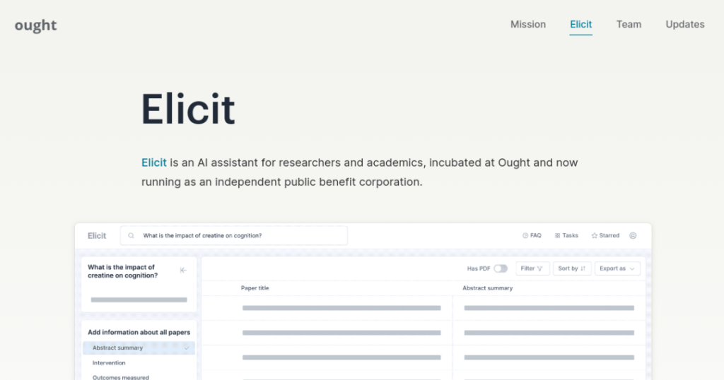 للاستفادة من Elicit، يجب على الباحثين إدخال نص أو كلمات مفتاحية ذات صلة بمجال الاهتمام البحثي. ثم، بفضل تقنيات معالجة اللغة الطبيعية، تقوم Elicit بتحليل ومعالجة النصوص المتعددة المصدر وتقديم النتائج ذات الصلة والمرتبطة بالمجال البحثي. يتيح هذا للباحثين العثور على النتائج المثيرة للاهتمام والمعلومات المفيدة في وقت أقل وبكفاءة أكبر. بالاعتماد على التقنيات المتقدمة في مجال الذكاء الاصطناعي، تسهم Elicit في تسريع عملية البحث الأكاديمي وتعزز جودة النتائج المستخلصة.